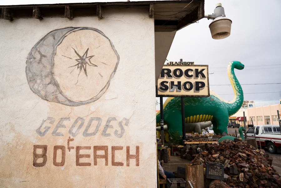 Next to to the station was yet another Arizona rock shop. The Rainbow Rock Shop, featured many large plaster dinosaurs with a couple in particular looking suspiciously like re-purposed Sinclair mascots. Boasting for miles around 80 cent geodes, we ventured over to be sorely disappointing at the find. The "famed" geodes were barely pebbles, averaging the size of half a golf ball. The dinosaurs were interesting enough to warrant the stop however.