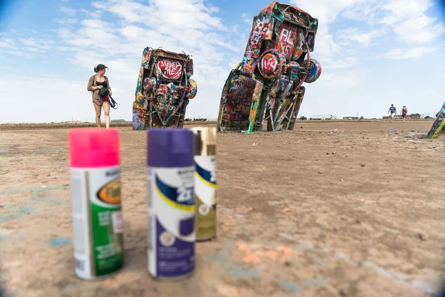 Cadillac Ranch is one of those places that screams tourist trap. The place is a great stop to break up the monotony of a long drive, however, due to its interactivity. People are encouraged to take part in the piece and spray paint their own pieces onto the cars. We did not happen to bring paint with us, but other visitors were more than happy to share their unused supplies with us. We took some time to climb around and leave our own touch on a few of the cars.