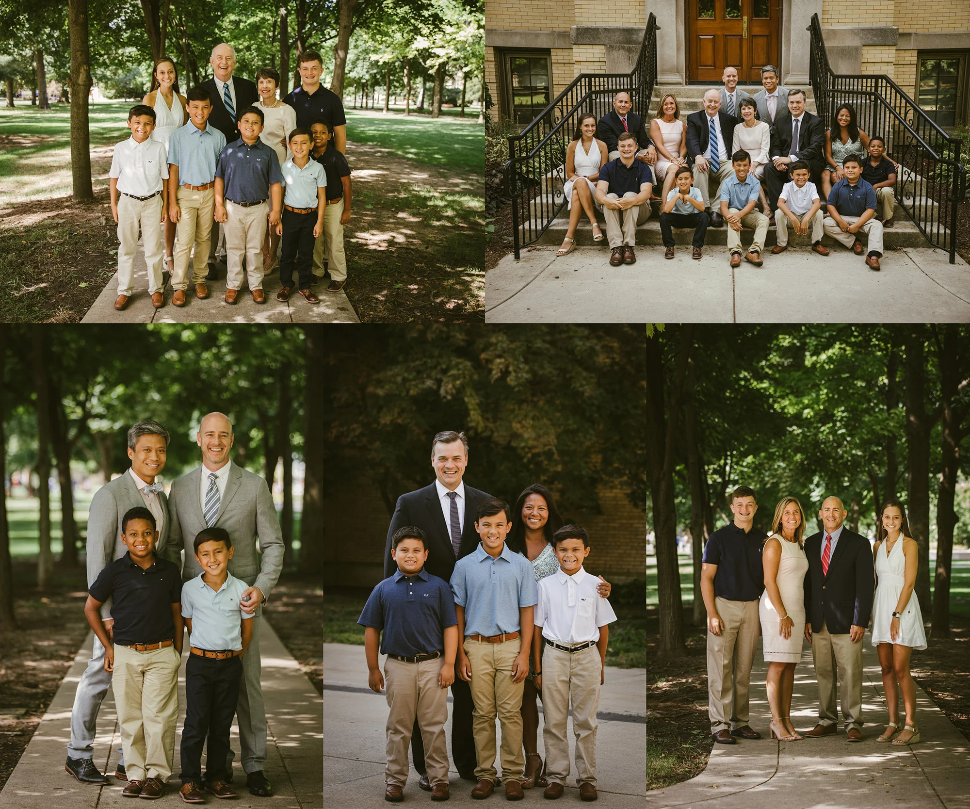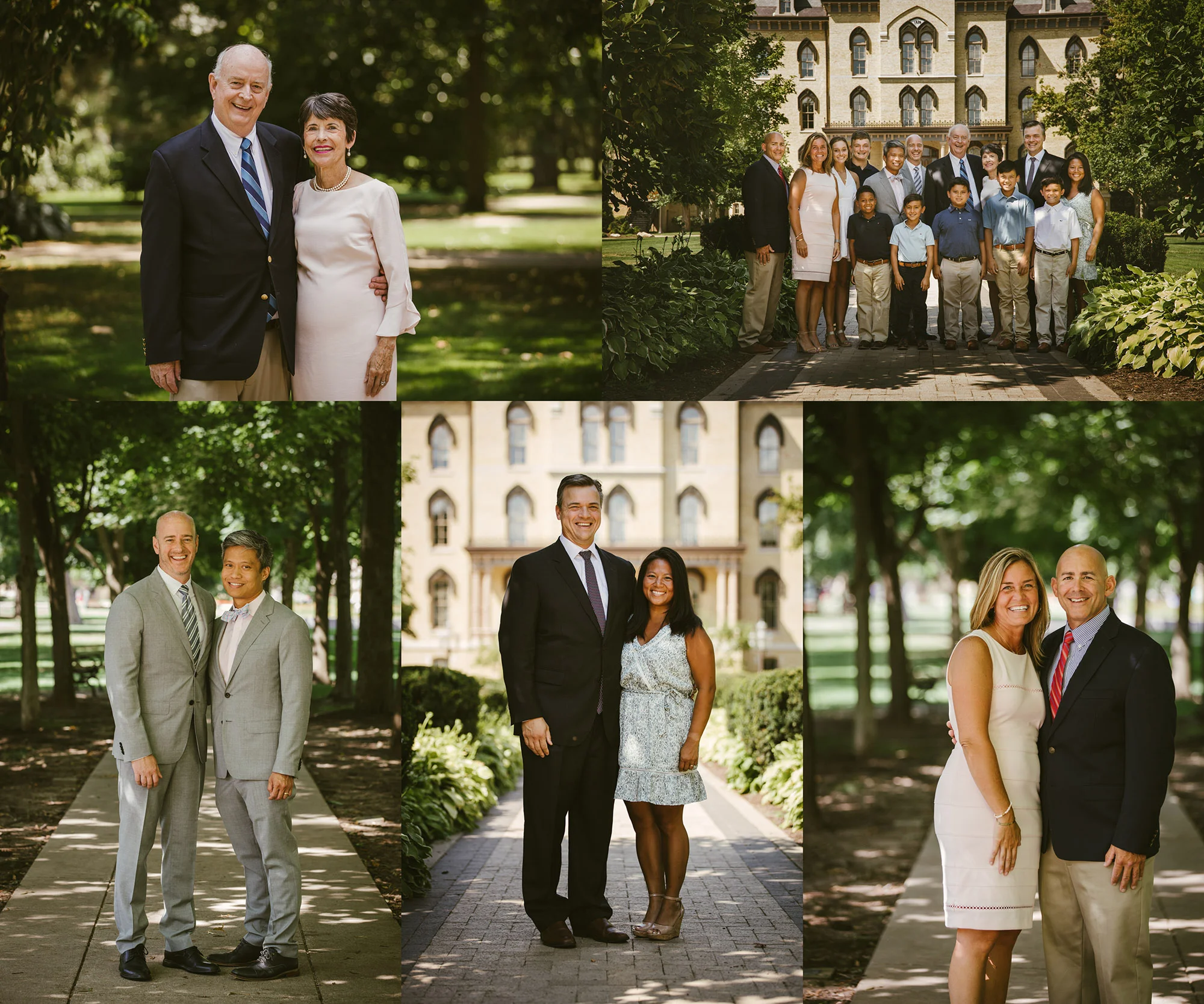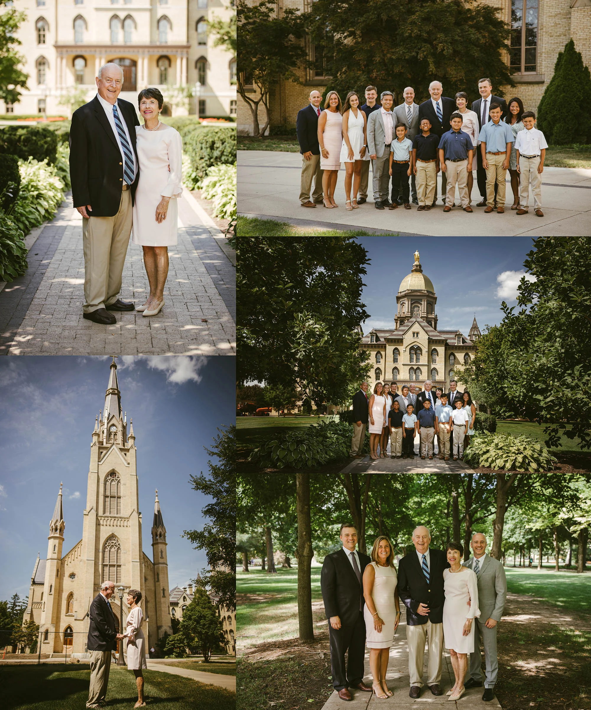 This family came in from far and wide to celebrate their parents’ (& grandparents’) Mary & John’s 50th Wedding Anniversary! Patrick, his husband Richard, & their kids came in from Atlanta, Georgia and brother Kevin, his wife, & their kids came in from New York! They all met up with Mary & John (who came in from Cleveland, Ohio) on Thursday and then sister Elyse, her fiance, & their kids drove in from Cleveland, Ohio on Saturday morning! They planned their Family Portrait Session for Saturday at Notre Dame right before they all headed to the 5 p.m. mass at the Basilica of the Sacred Heart and then had dinner at the Morris Inn on Notre Dame’s campus! Saturdays on campus in summer are a bit crazy since there are most often 4 back-to-back weddings within the Basilica before the 5 p.m. mass, but luckily at their start time of 3:30 p.m. a wedding had finished up at 2 p.m. (with photos outside afterward) and another wedding had started a half hour prior at 3 p.m.