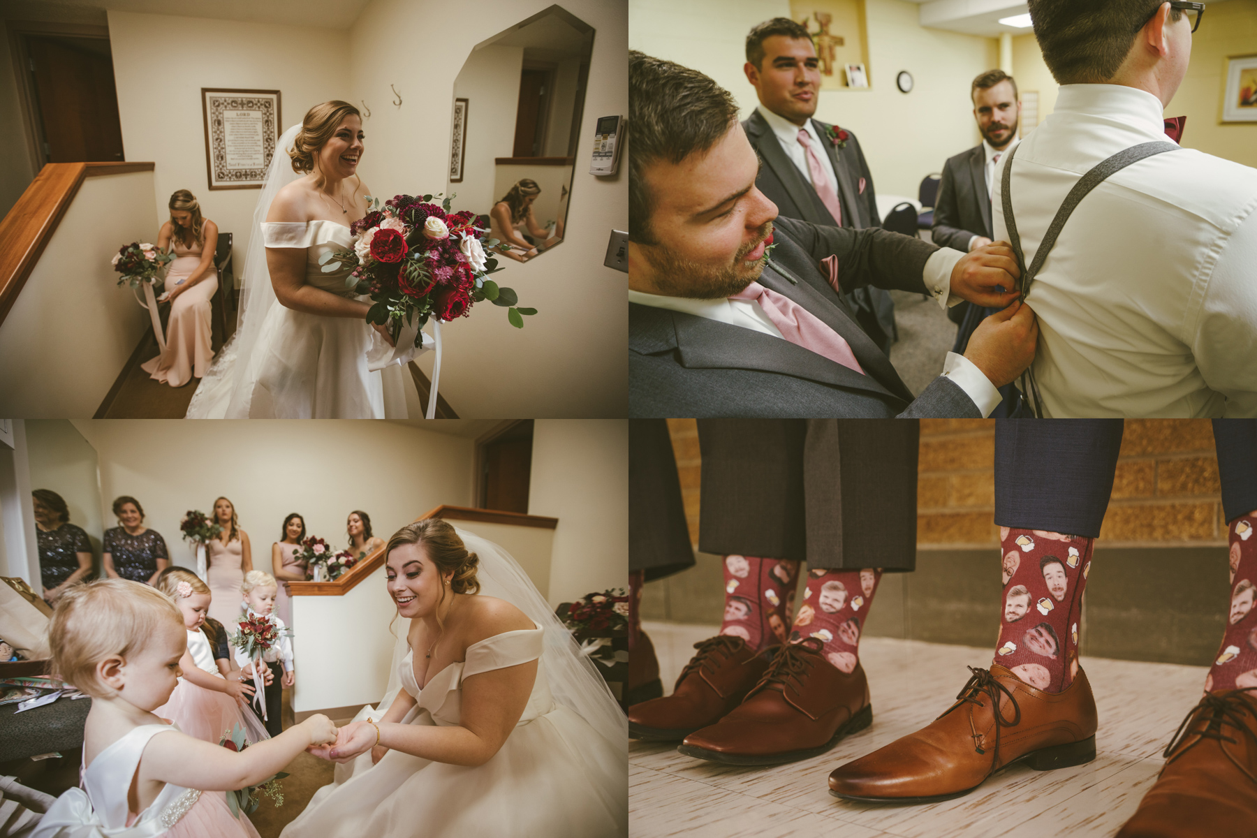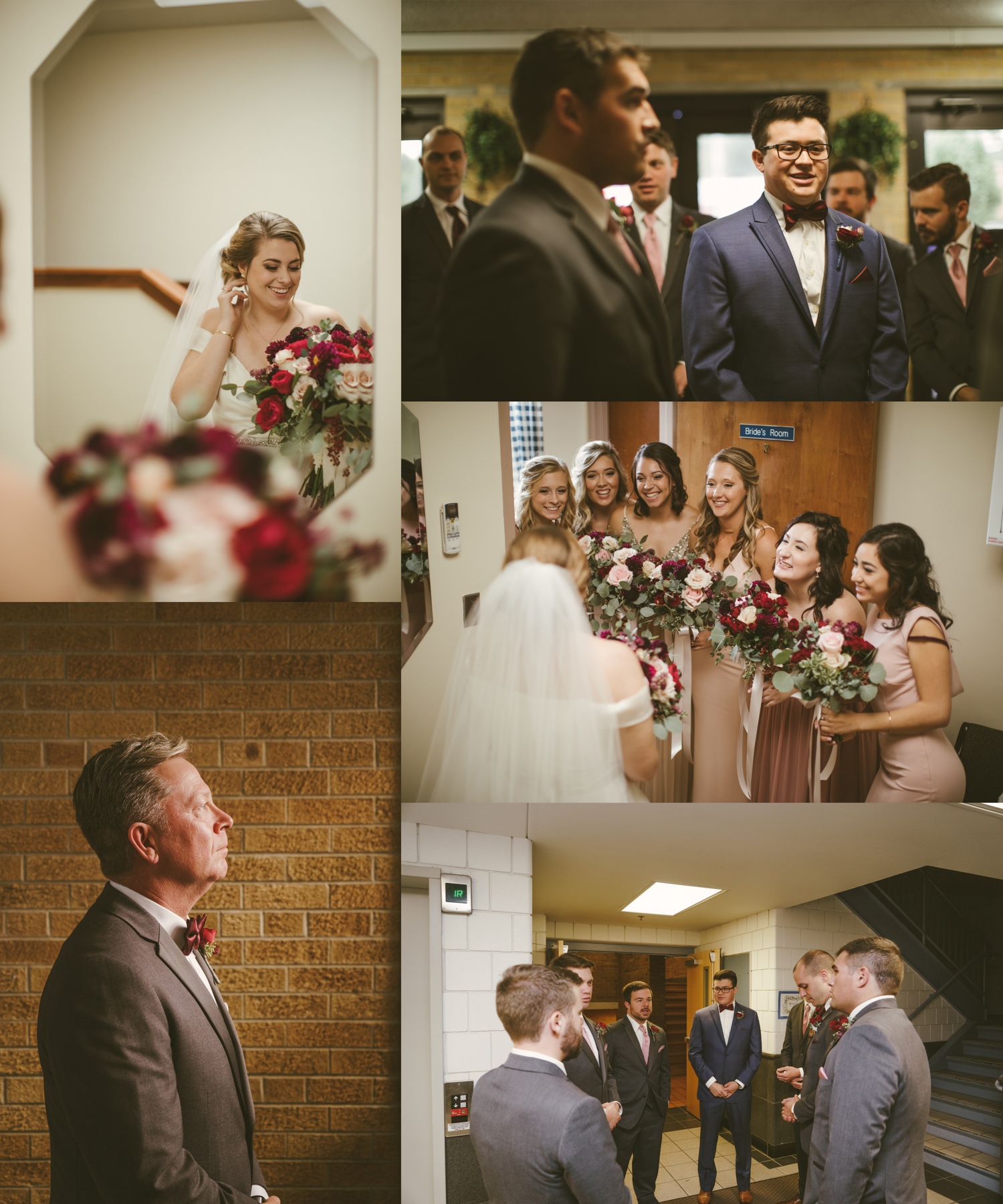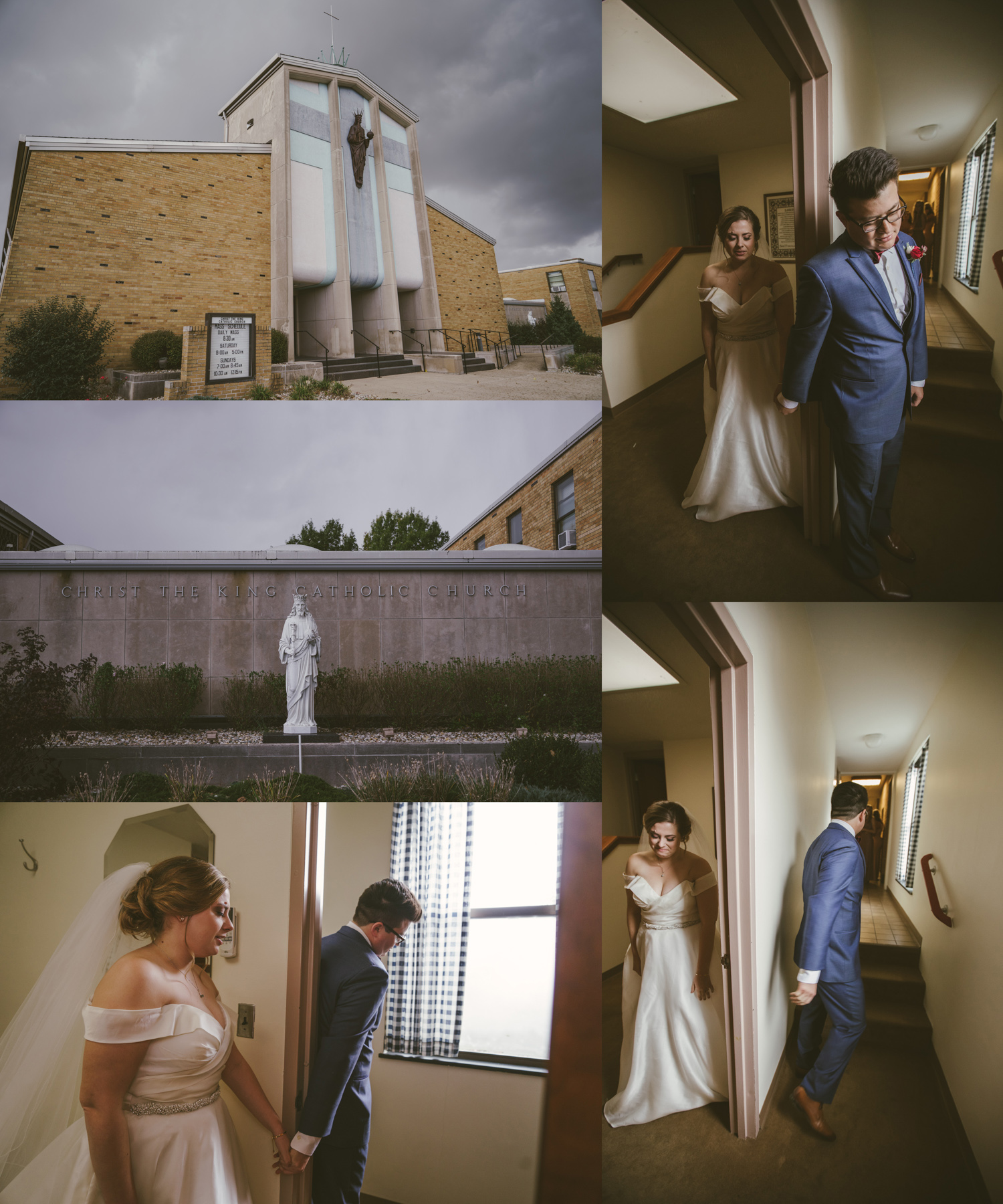 The clouds loomed ominously over the church when we got there, but there was still no rain by early afternoon. We gathered all of our umbrellas that we provide to our wedding clients and made sure to bring them inside and store them at the back of the church for the bridal party when we expected it to downpour after the ceremony. Once we got inside it was immediately time for Allison & Tim to pray together still hidden from each other by a doorway. They prayed emotionally together and it was about time for the ceremony!