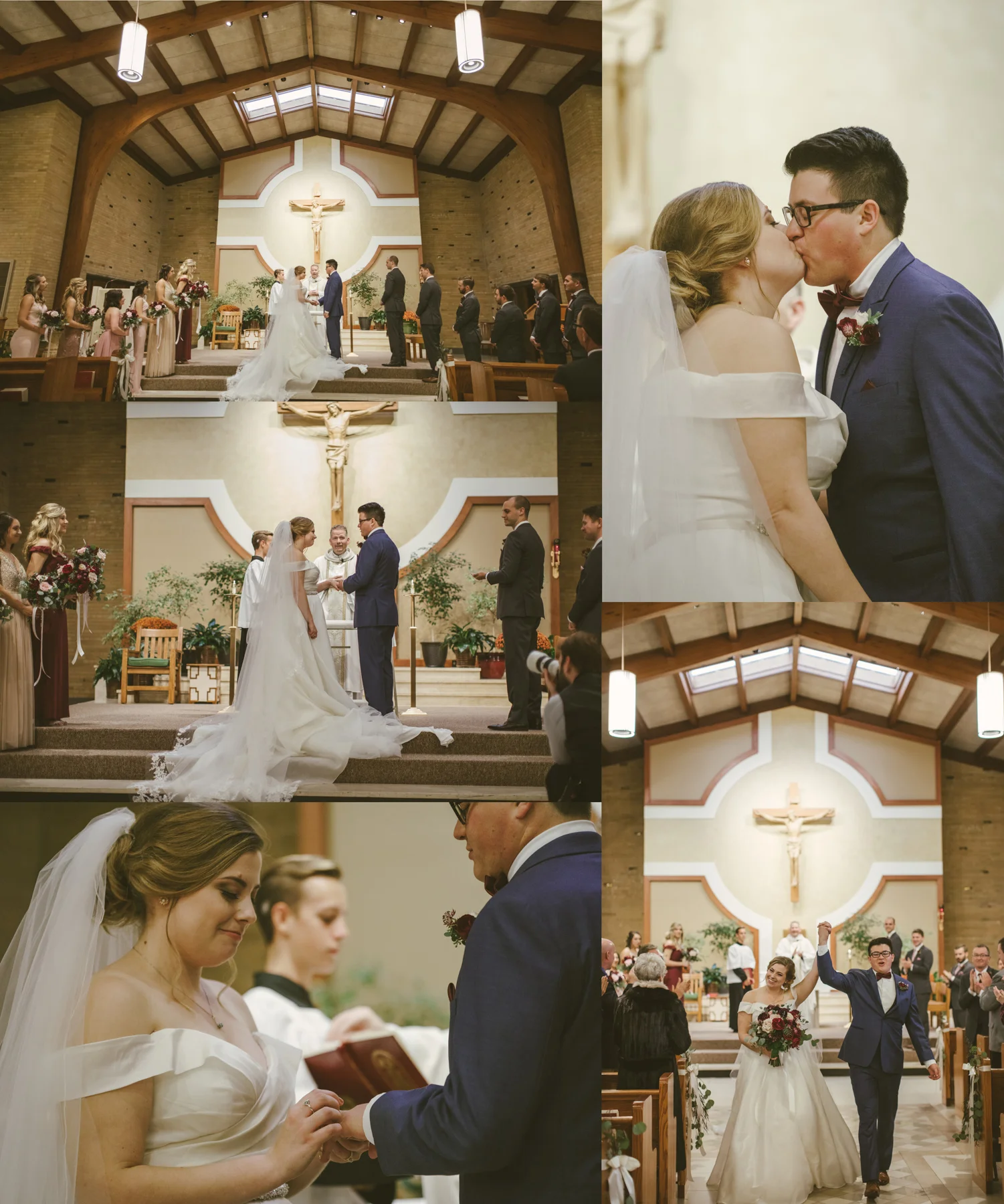 During the Catholic mass, vows and rings are exchanged earlier in the ceremony amidst a full hour Catholic mass, but for our photos and story telling we placed them near the end right before their first kiss as a married couple (instead of right after the Veneration of Mary as it actually went). With that kiss the ceremony was over and they headed back down the aisle a married couple!