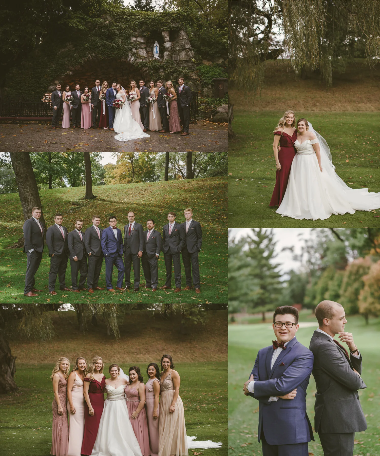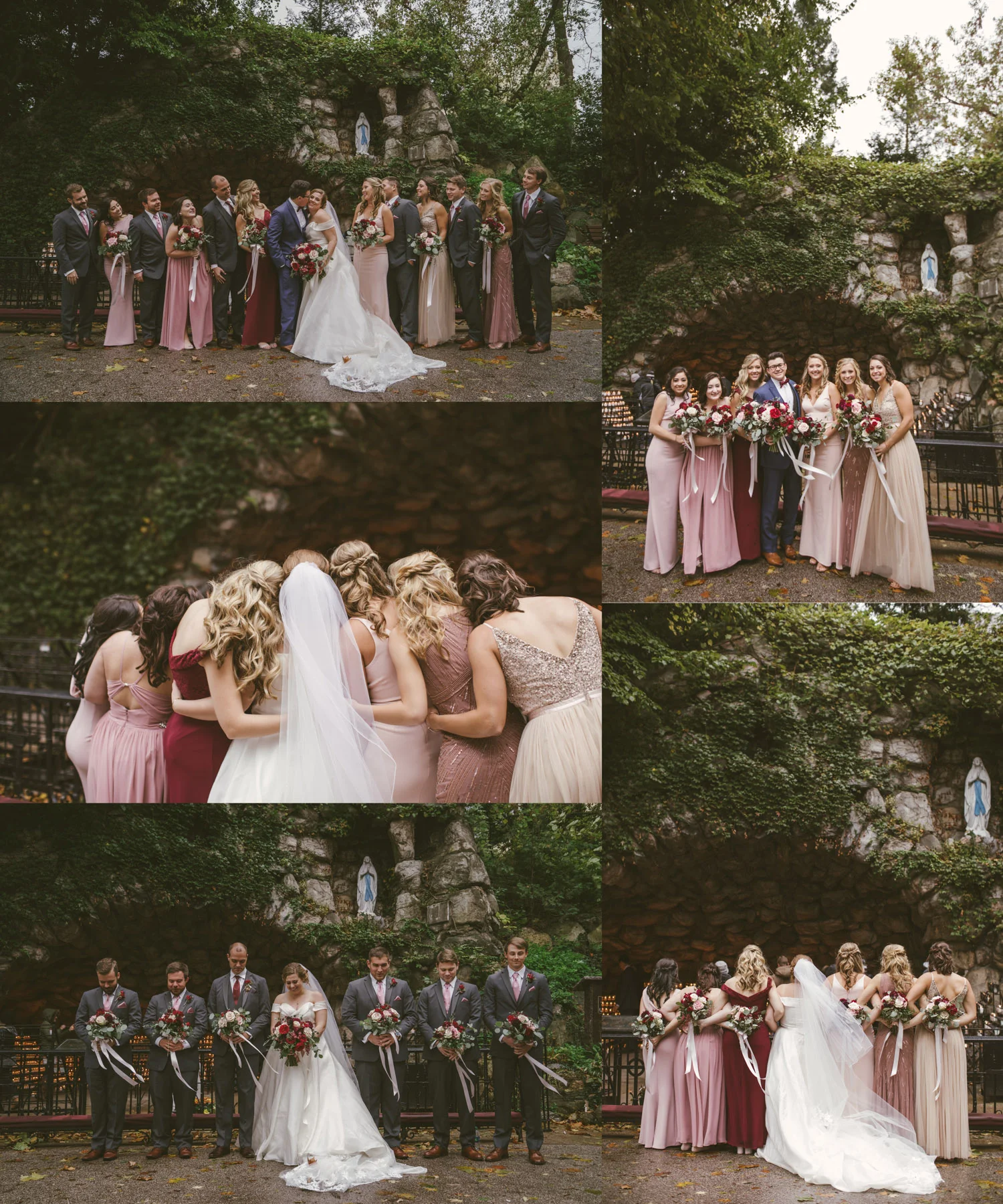 The wind was pushing in the cold air at the University of Notre Dame’s grotto while we were all there around 5 pm, but the sky was dry for a moment as we utilized our full 15 minutes for the full bridal party photos and finally outdoor portraits of Allison and Tim married-! Everyone was cold, so we didn’t push it, but we knew that we wouldn’t be able to utilize Morris Park for the additional 45 minutes of portraits as planned when we returned to the reception (since the sky was turning black again and we knew more bad weather was on the way) so we made sure to capture the most important things on their list!