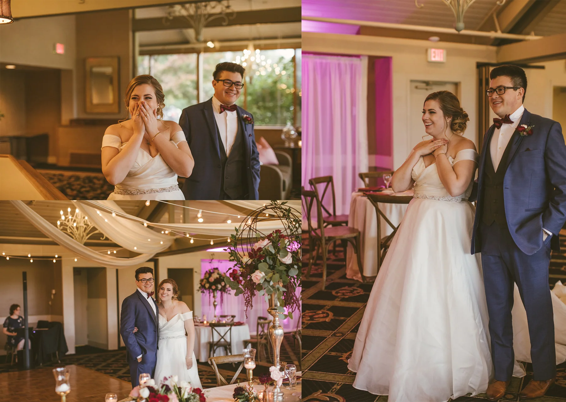 Instead of more portraits, Allison and Tim got a private room reveal of their wedding reception fully decorated while guests enjoyed cocktail hour! It was extremely gorgeous and we loved the color scheme, flowers, and decor so much.