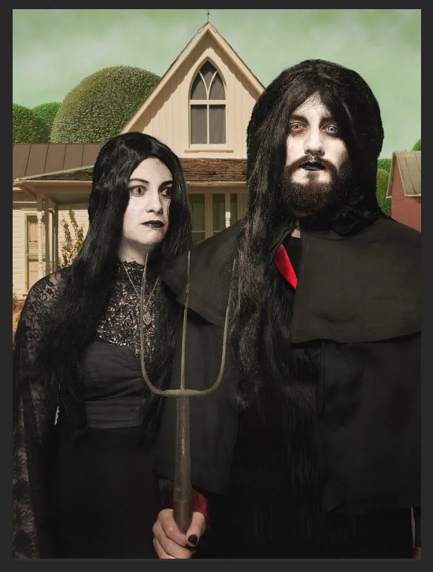 Thankfully the internet is a great tool for seeing projects like this come to fruition. Through a series of Google searches, we were able to find an actual photo of the home used as inspiration by artist Grant Wood when painting "American Gothic". This gave us a great beginning point for creating the background for the final composite. We reworked the image of the home, taking some efforts to recreate the iconic background seen in the painting. Details such as the sky, color of the windows, unrealistic rounded trees, and barn needed to be built into the image. While the background of our image doesn't match exactly what is seen in the original painting in tonality and explicit detail, we did make some efforts to make the shot quickly visibly readable.