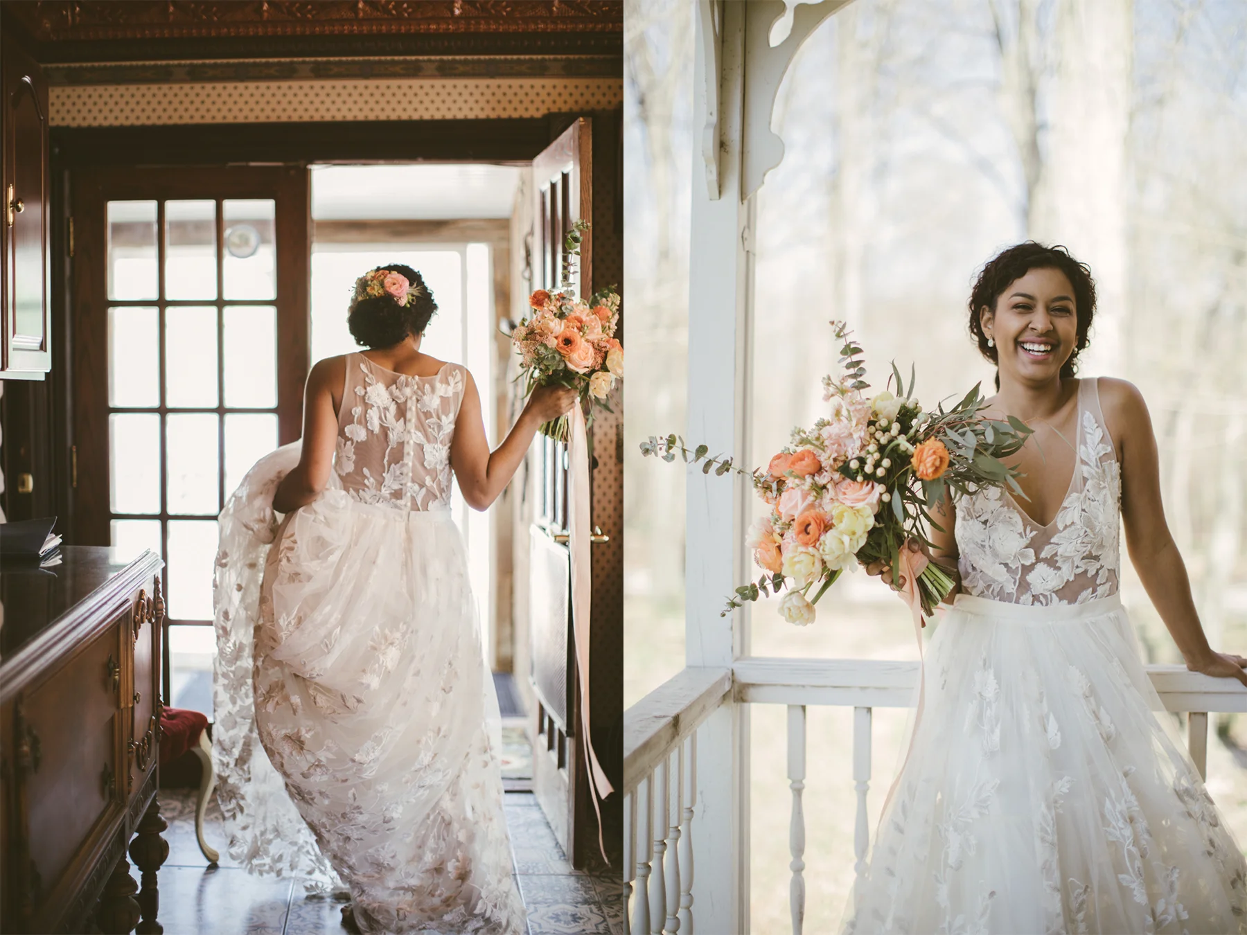 A little more Asia: Asia is a fierce, independent woman with drive. She's also very laid back and it was a pleasure to photograph her in her beautiful, sort of edgy wedding gown with a sheer lace top (from Detroit Bridal House)! It was a bit cold since Spring was pushed back a full month this year weather-wise and summer had an odd weather start (colder than usual at first with tree buds not coming in for a long time), but she was a trooper so we could get some photos of her outside on the porch after the prep photos inside! Luckily her wedding planner Darion Longmire had allotted enough time for this bit of time, so we were thankful for that (and thankful for the gorgeousness of the flowers- Flowery Art florist created all of the beautiful bouquets!). Like we said, it's always wonderful when we're able to get even a few photos outside of the bride and groom even on those immensely hot or frigidly cold days. We SO appreciate that our couples put up with us begging them to just step outside for a second for us to capture some classic portraits that will last for a lifetime! Thank you so much Asia for bearing with us outside and for genuinely laughing when you had goosebumps!