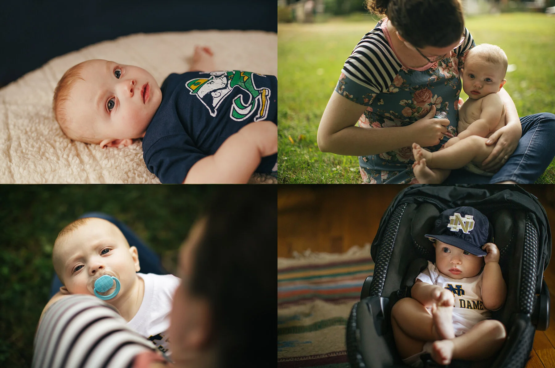 One such family had a momentous trip 3.5 months ago! You may remember Caitlin & Joe, but if you don’t, these two were in Notre Dame’s band in college, they lived separately in Indianapolis and Pennsylvania before their wedding as one worked at a school for the deaf while the other got an MBA degree, we captured their Engagement Session in mid-2016 at a Michigan lake in a rowboat & on piers, we captured their wedding in mid-2017, they then moved to Nebraska, they bought a house, and then this year they had their baby this Spring! We had planned on capturing a Family Portrait Session of the 3 of them together this Spring if they happened to come back in town (so the plans were tentative), but instead ended up getting to capture a Lifestyle Infant Session of their 7 month old son John at the start of September-!