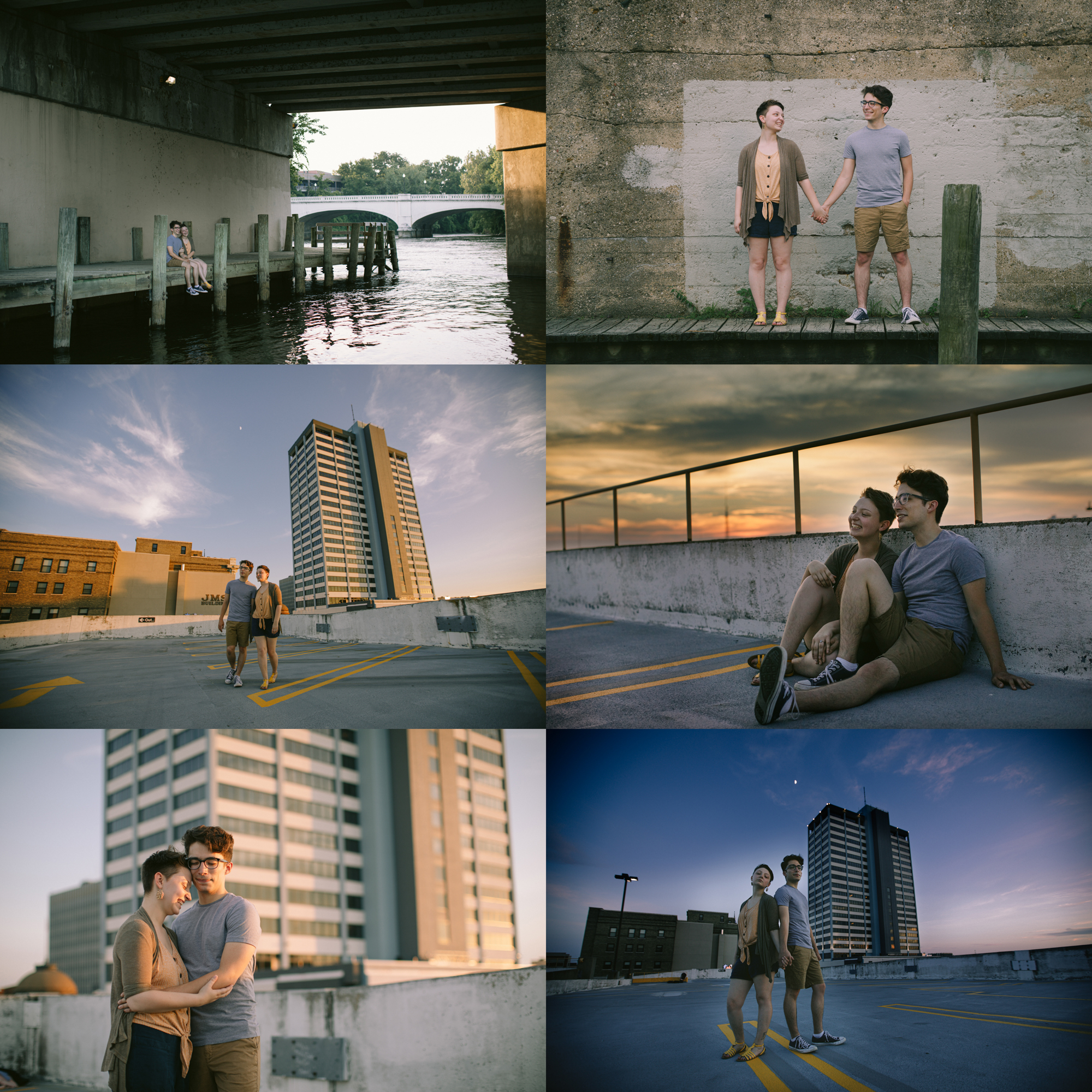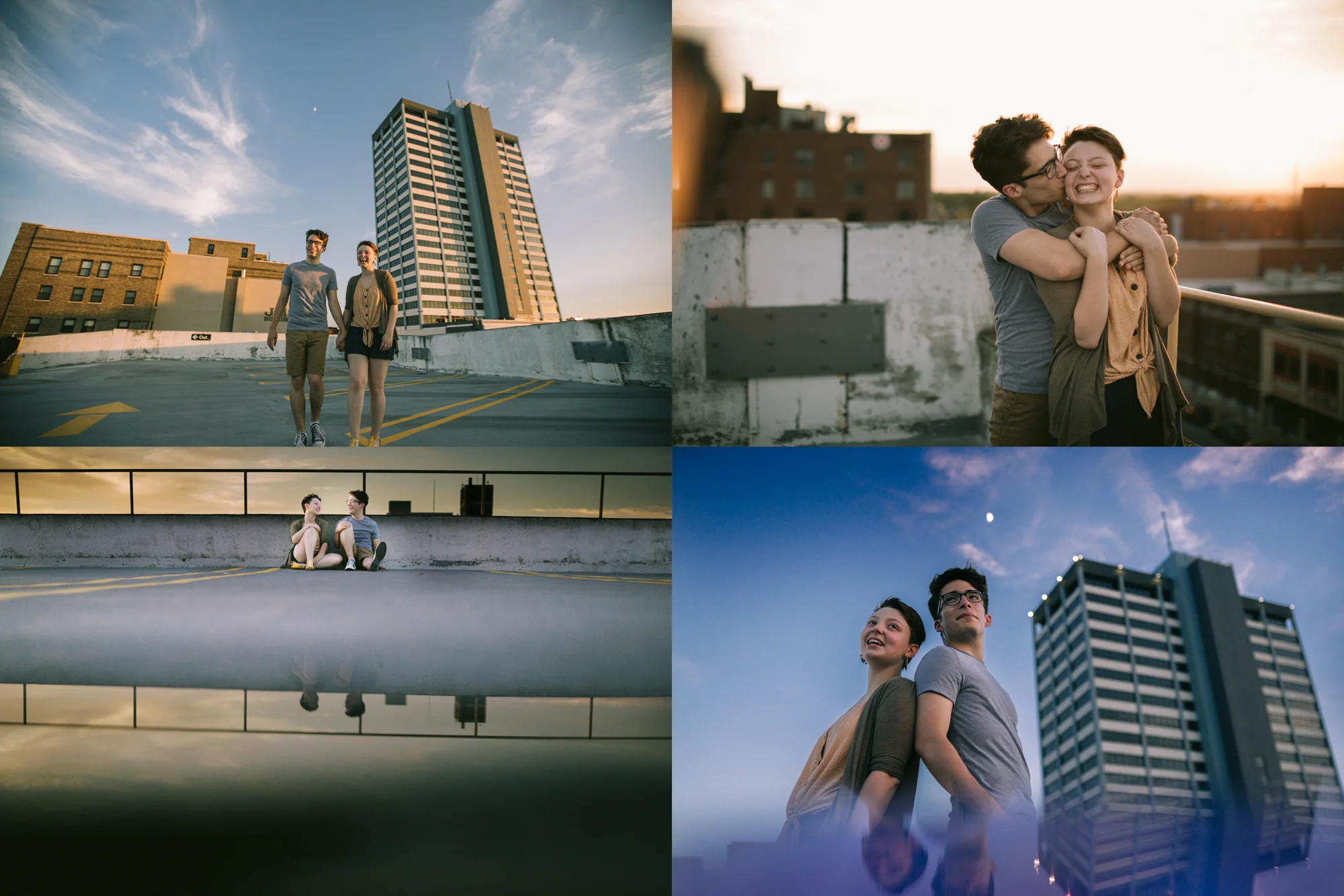 Another of the spots that we captured these two at was the top of a parking garage. Parking garages are often spots that photographers like to take portraits (also evidenced by a girl photographing a couple of folks on top of this one before & while we were also up there), but Bee and Jordan chose this spot because it’s actually a special spot that they’d hang out at as teenagers while dating-!