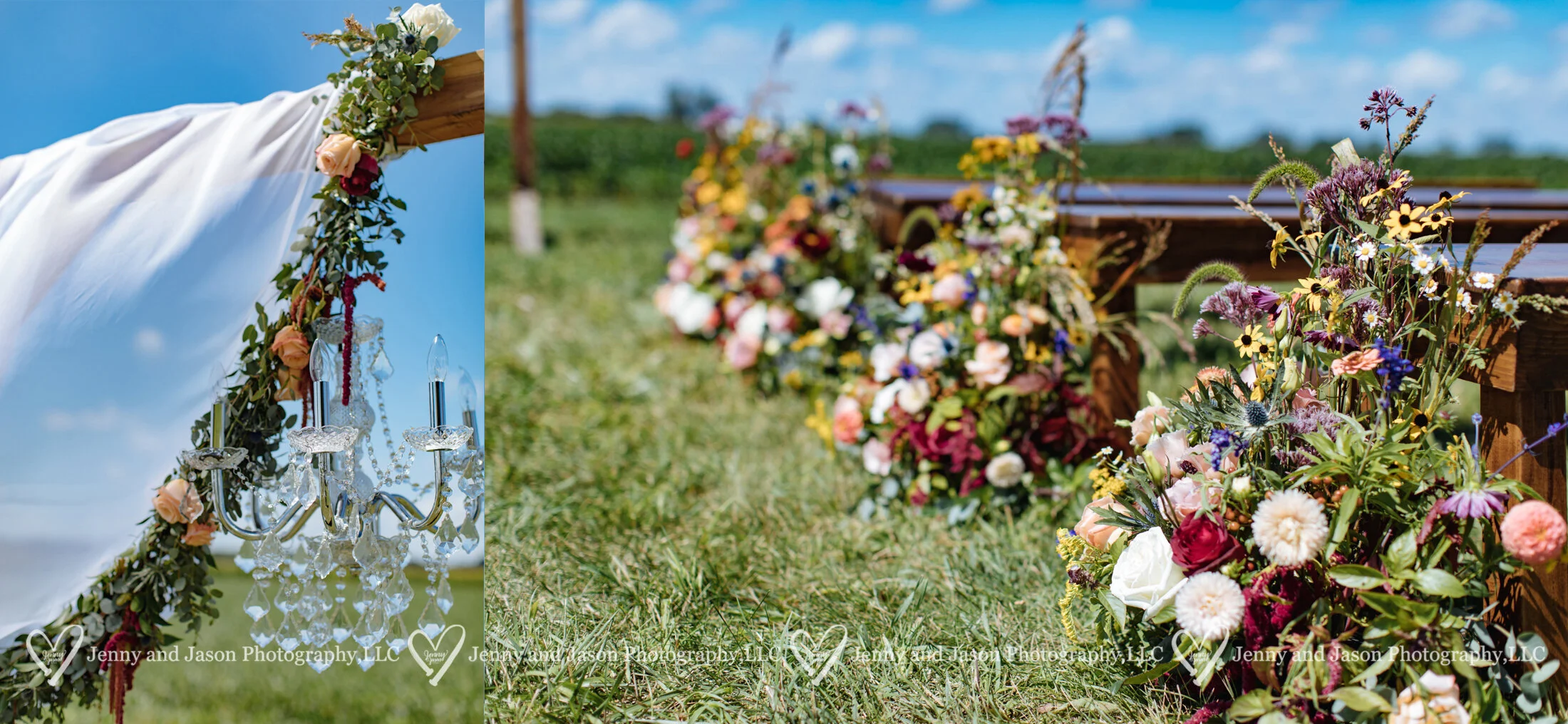 Rentals: Burns Rent-Alls, Inc. Special Events (The benches/ ceremony things, blue couch by the corn field, tables in the reception area!)