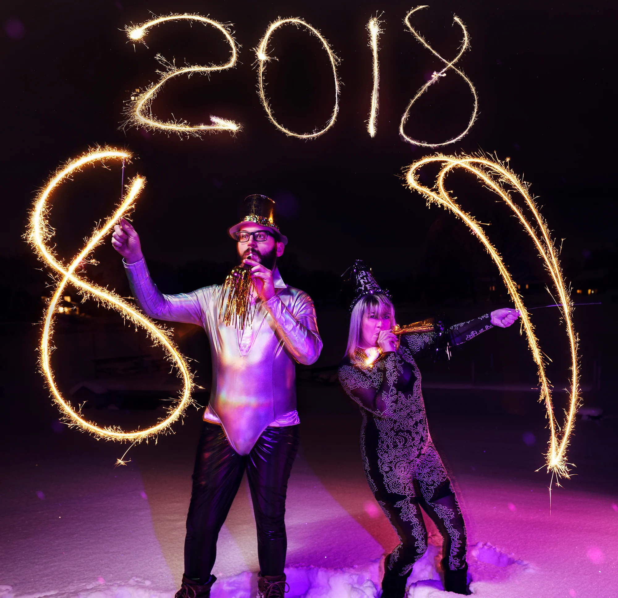 Happy New Year and welcome to the grandest year so far...2018! Most everyone has a tradition that they like to enjoy to help ring in the new year. As the clock counts down and midnight approaches, some people pop a bottle of champagne, light sparklers, or sing Auld Lang Syne. We on the other hand celebrate the New Year with a ridiculous portrait that incorporates some traditional forms of celebration with a personal touch.
