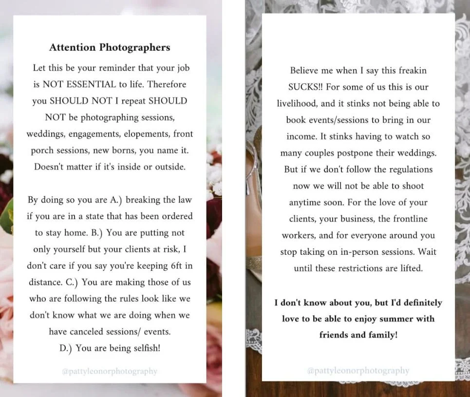 In this stressful time though, we’re SO glad that we own our home & that we made our newest Homeowners Insurance monthly payments (as we’d literally just moved to a different insurance company with a new policy in early March). We’re SO glad that everyone is prioritizing the HEALTH of the people in this nation, their families, their friends, & strangers. We’re so happy that Jenny’s parents randomly gifted us food for our 3 pets and a grocery gift card weeks ago. The most important thing at hand in the world is that we keep as many as possible from literal DEATH from this awful virus. In order to do that, we have to be responsible. MONEY and IMPATIENCE are not more important than ANYONE’S LIFE. ANYONE. We take VERY seriously keeping our clients healthy. The point of these events, wedding day, etc is for people to be happy and to celebrate. How happy can we be if we know that the event being held in THAT moment will kill some of the guests…? These guests were invited because they’re LOVED by the bride & groom and their loved ones.