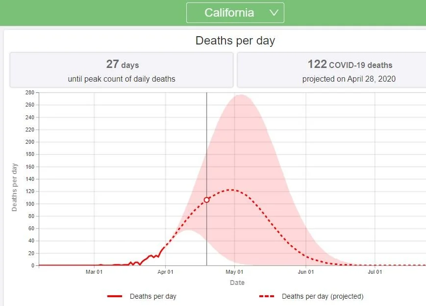 We’re also very worried about Jason’s family- especially his 85 year old grandma. His mom, grandma, & uncle all live together in California with his mom still working full-time at a fire station (where 2 firefighters got Covid-19 weeks ago), so we’re stressed to say the least.with California having the 3rd most cases in our 50 states AND all 3 of them have underlying conditions! As we said, Jason’s twin brother has a 6.5 month old daughter and Jenny’s sister is 6 months pregnant. Well… 3 of the 4 of those parents work in healthcare. Jenny’s sister is an Occupational Therapist who works at a hospital and her husband is also an Occupational Therapist. Luckily Jason’s twin brother works for a corporation’s office and can work from home with his baby, but his wife also works in the medical field as a Speech Language Pathologist. We’re SO stressed for our siblings because they are raising babies and they also work in healthcare with NO great options to protect their faces/ bodies from the virus, so we’re worried. Here’s California’s chart on projected deaths during Covid-19 right now in California & Arizona WITH the current Shelter at Home regulations on 80% of the nation: