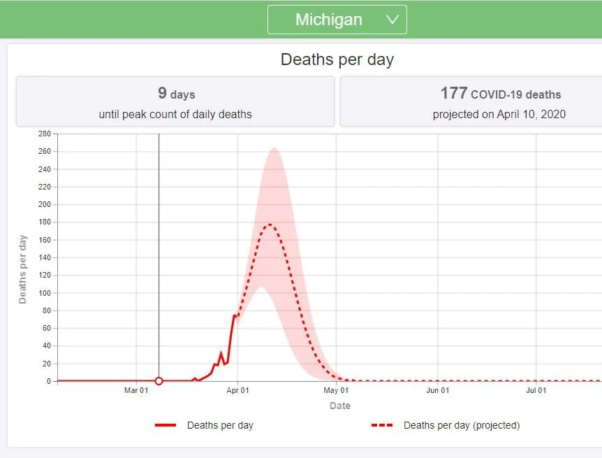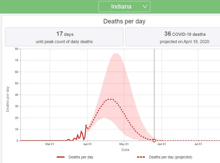 **Sadly just 10 minutes over the border in Michigan numbers have risen! This means that they will hit their highest number of deaths in one day first out of our 3 states. Because of that, numbers should drop by May 1st when is the 1st day Trump projects that we may be able to leave the house. They are now the 4th worst in the nation. A lot of this can be due to Detroit and other busy cities, but we also noticed that businesses closed MUCH later than Indiana’s due to a belated Stay at Home on Michigan’s part.
