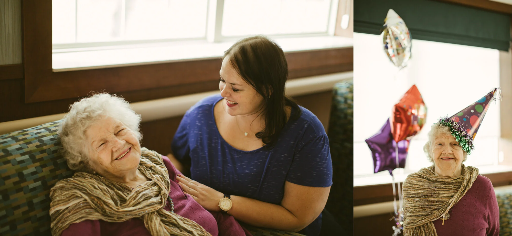 Irene posing with her granddaughter Victoria as well as donning a celebratory birthday hat given to her for her 98th Birthday. Healthwin, South Bend, IN.