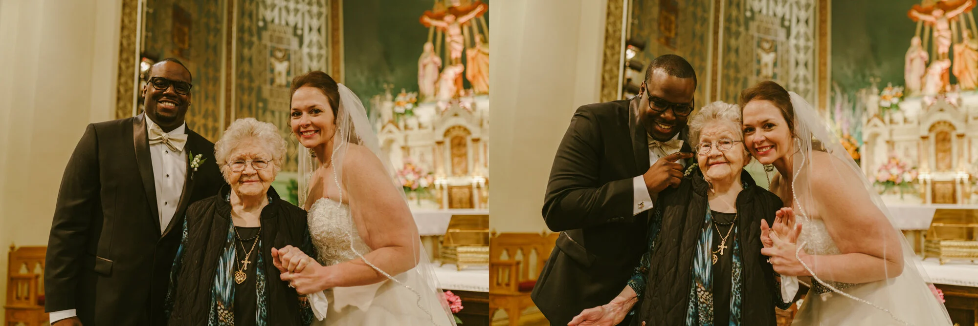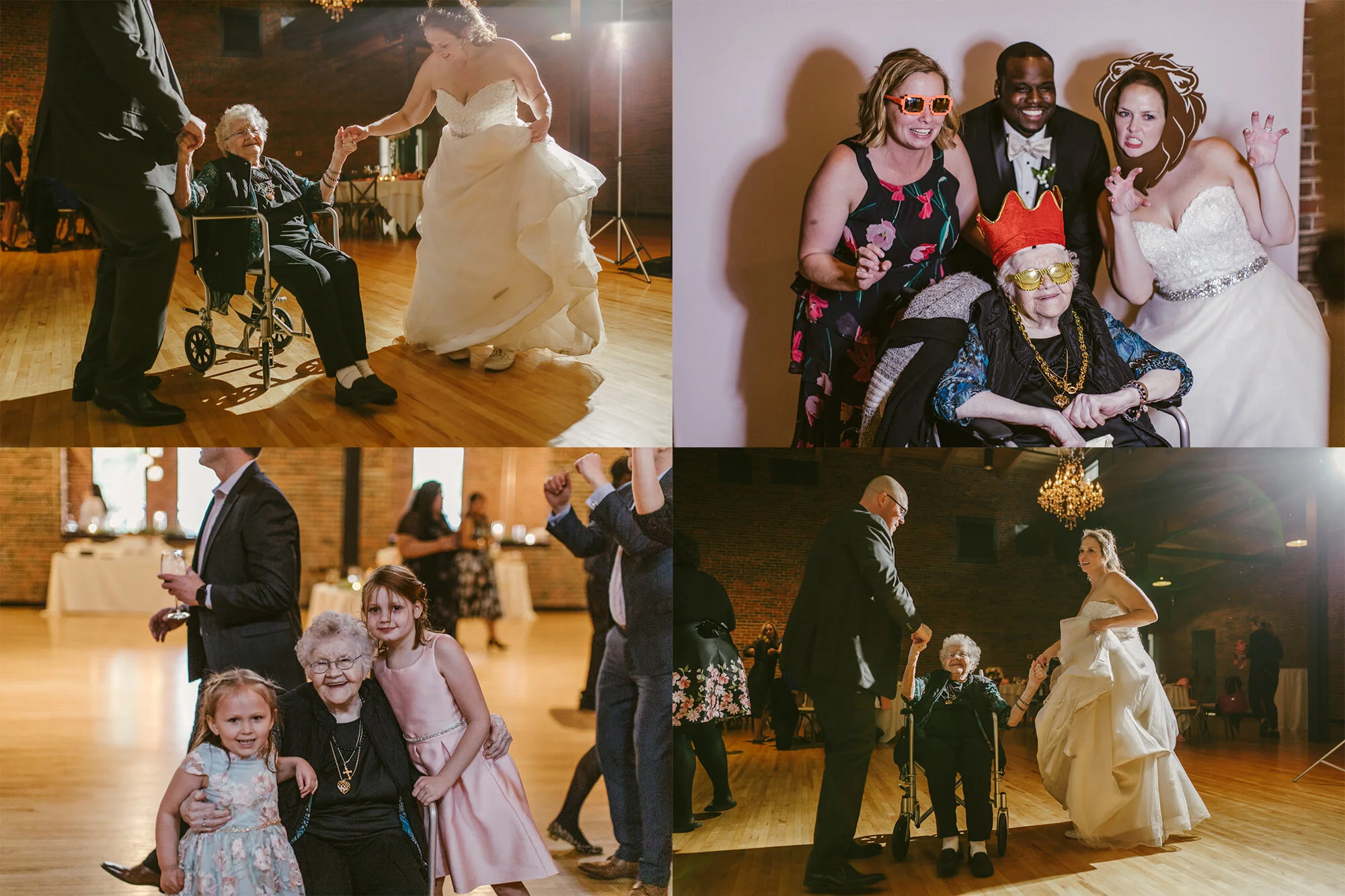 Here are some photos of Irene at her granddaughter Victoria & Alex’s wedding just ONE year before she passed away from Covid-19. Irene was at her church for the wedding (St. Casimir where she’s gone since they sponsored her family- including Victoria’s mom- to move to the U.S. in 1951), then at the ripe young age of 99, cut a rug at the reception and even enjoyed the wedding photobooth-! Irene & her late husband had 5 kids (2 that they had at the refugee camps in Germany/ 3 that they had here in South Bend, Indiana), 17 grandchildren, and 14 great grandchildren which became very obvious when we went to capture the 3 page long list of family portraits post wedding ceremony-! You can check out those Teasers from our blog from a year ago by clicking on that link here: https://www.jennyandjasonphoto.com/blog/chicagoans-victoria-alex-st-casimir-the-armory-south-bend-wedding