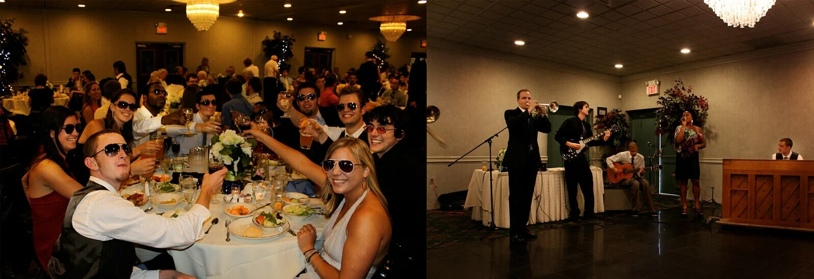 Meanwhile right after the ceremony, their close friends and bridal party made their way to the bus they had and got ready for the reception. Kevin's aunt photographed most of the reception since I was only hired to photograph the ceremony at the church, but since I was friends with the band MojoFlo and one of my best friends was also in attendance with one of the band members, Kevin told me to come by the reception as well. I also made sure to some photos while enjoying dinner. Aani serenaded Kevin with a special opera song on the dance floor and then Kevin's band MoJoFlo (still a TOP band in the capital of Columbus, Ohio) played some beautiful music as everyone enjoyed their time. At one point Kevin's "band friend table" where I was seated all decided to wear their sunglasses at night and have a blast. All-in-all it was a great wedding and beautiful day. Shortly after the wedding and start of their marriage, Kevin and Aani moved to Illinois for her Master's program, so it was actually the last time we saw them in person!