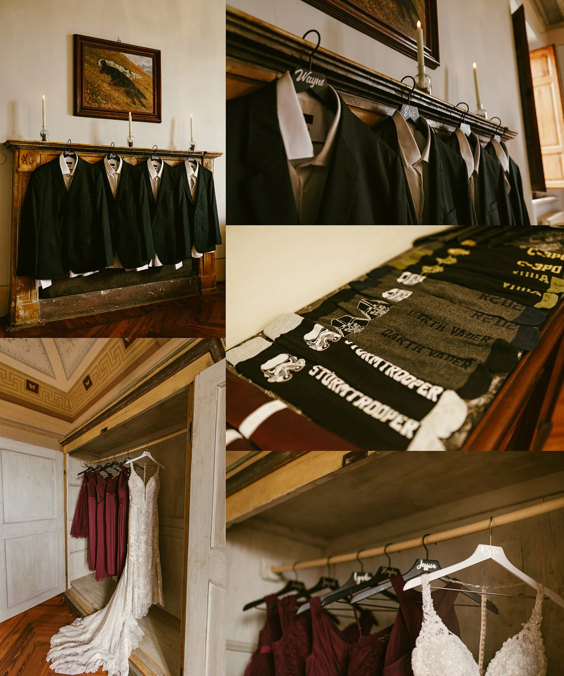The entire bridal party had custom hangers with their names on them, Kyla gifted the bridesmaids prosecco with their names and the wedding date on them, and the groomsmen got Star Wars socks from Walt!