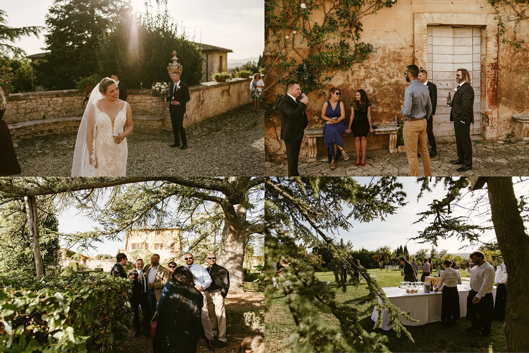The start of Italy: Kyla & Walt were kindly ok with us going to Italy early with the flights they got us, so we spent a week traveling from Pisa to La Spezia to Cinque Terre to Urbino for 4 nights (Jenny’s old city of study & living in her apartment at the end of her freshman year of university) to Florence to Pisa to see the leaning tower and lastly to hot springs and Siena on our own dime with a cheap rental car and awesome AirBnBs booked a half year in advance! After that initial week, we along with all 70 guests checked in to Kyla & Walt’s wedding venue villa in Castlenuovo, Italy at Villa Catignano last Tuesday evening just ONE week ago! Kyla, Walt, family, and many friends drove the 9 hour drive into Italy from Germany stopping along the way at various beautiful vistas, tourist spots, etc! Once finally to the villa near Siena for the wedding week, all of the family, friends, and guests mingled as they sat under amazingly large trees watching as sun set over Siena. The villa sits just about 18 minutes from the city center of Siena, but their plans for the night were to head up about 45 minutes north to around Florence for a meal from the world renowned butcher Dario Secchini at the restaurant Panzano in Chianti (featured on Chef’s Table a Nexflix series). We did not go (had we known we would have gone to photograph it!), rather cooked up some of our groceries that we’d gotten in the week in Italy leading up to Siena! It was a gorgeous night, so we unpacked, got our camera gear and wedding photography clothes all together, and just relaxed. We did manage to capture some photographs of Kyla, Walt, and their guests arriving and mingling before they headed out to the late dinner, though!