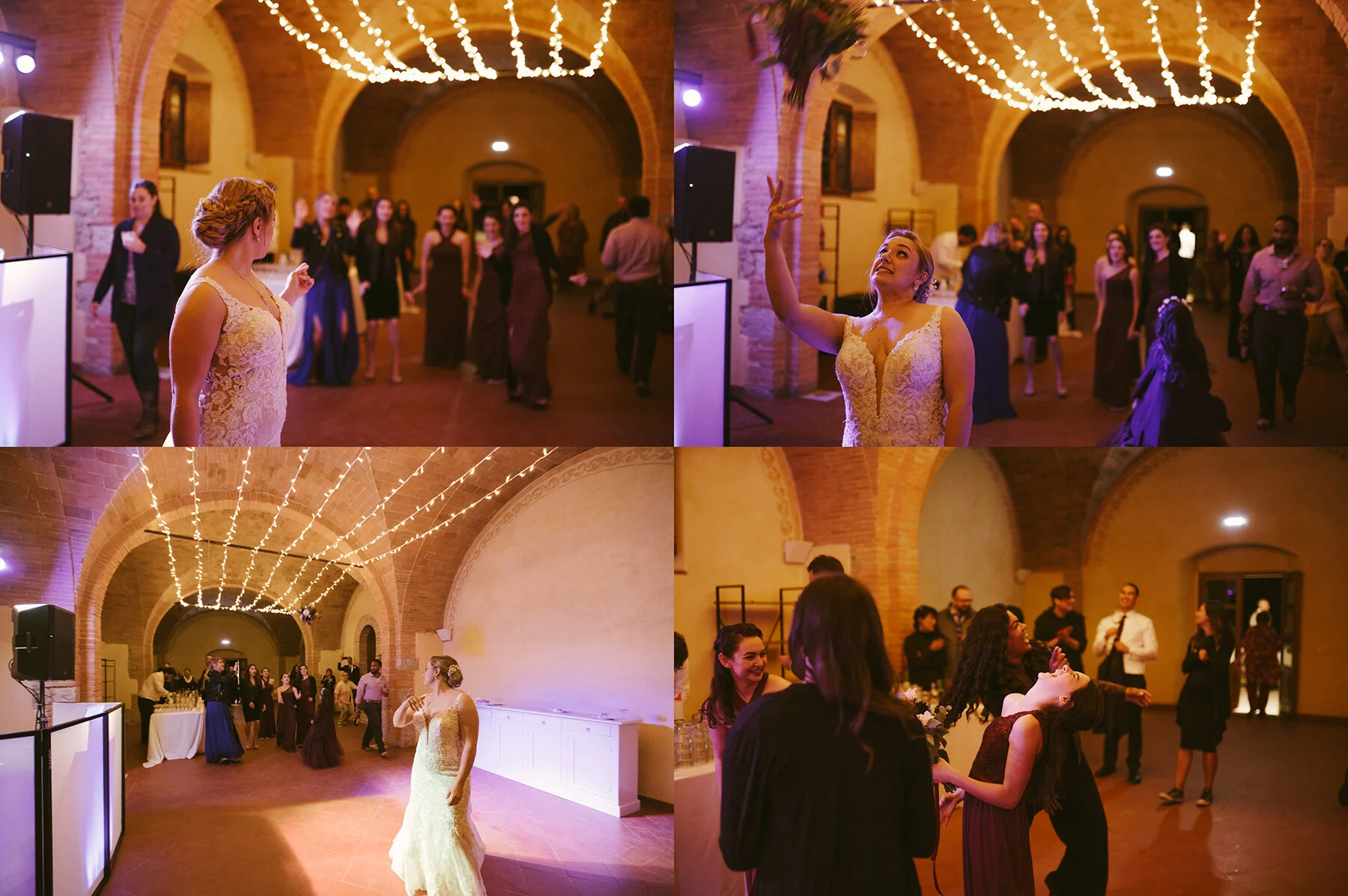 With that it was time for Phase Two of the reception: Dancing! Since the night became a little cooler, everyone headed into the the stone portico-looking wedding reception hall! The wedding planner had Kyla and Walt start the indoor portion of their reception off with their bouquet and garter toss. One of Kyla’s nieces caught her flowers!
