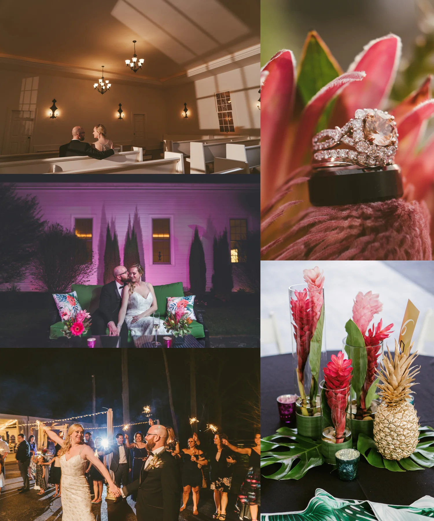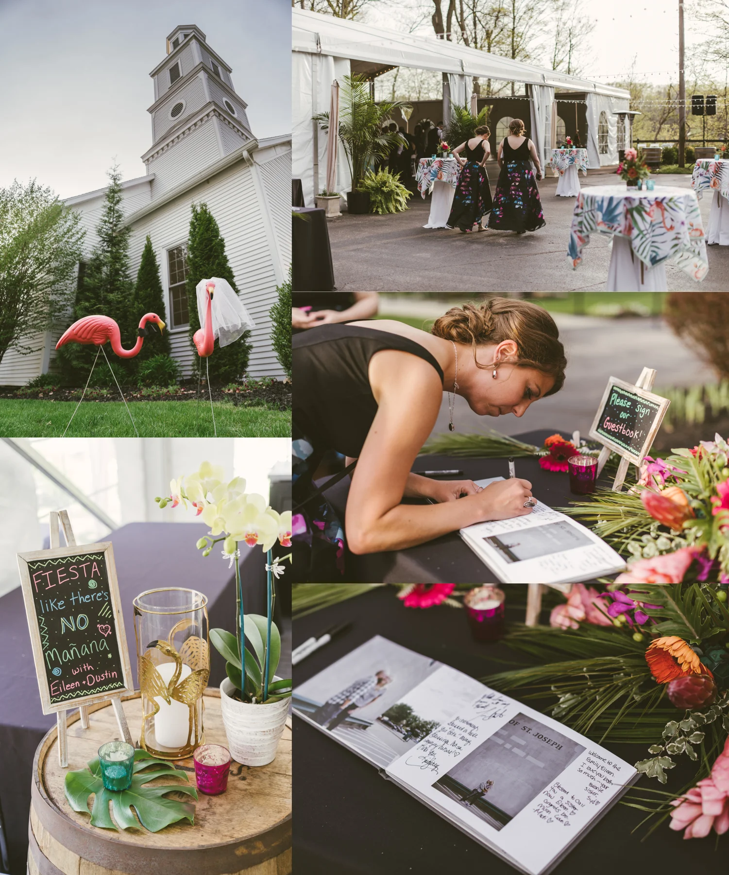 Since their wedding was on Cinco de Mayo, these two incorporated a bit of a tropical theme into their wedding! Their wedding cake had flamingos on it, there were golden pineapples on the tables, there were tropical leaves and flowers all over the chapel/ reception/ in the actual bouquets, the church had two flamingos outside of it, their food items included elote and more, and their photobooth included cute sombreros which the kids loved!