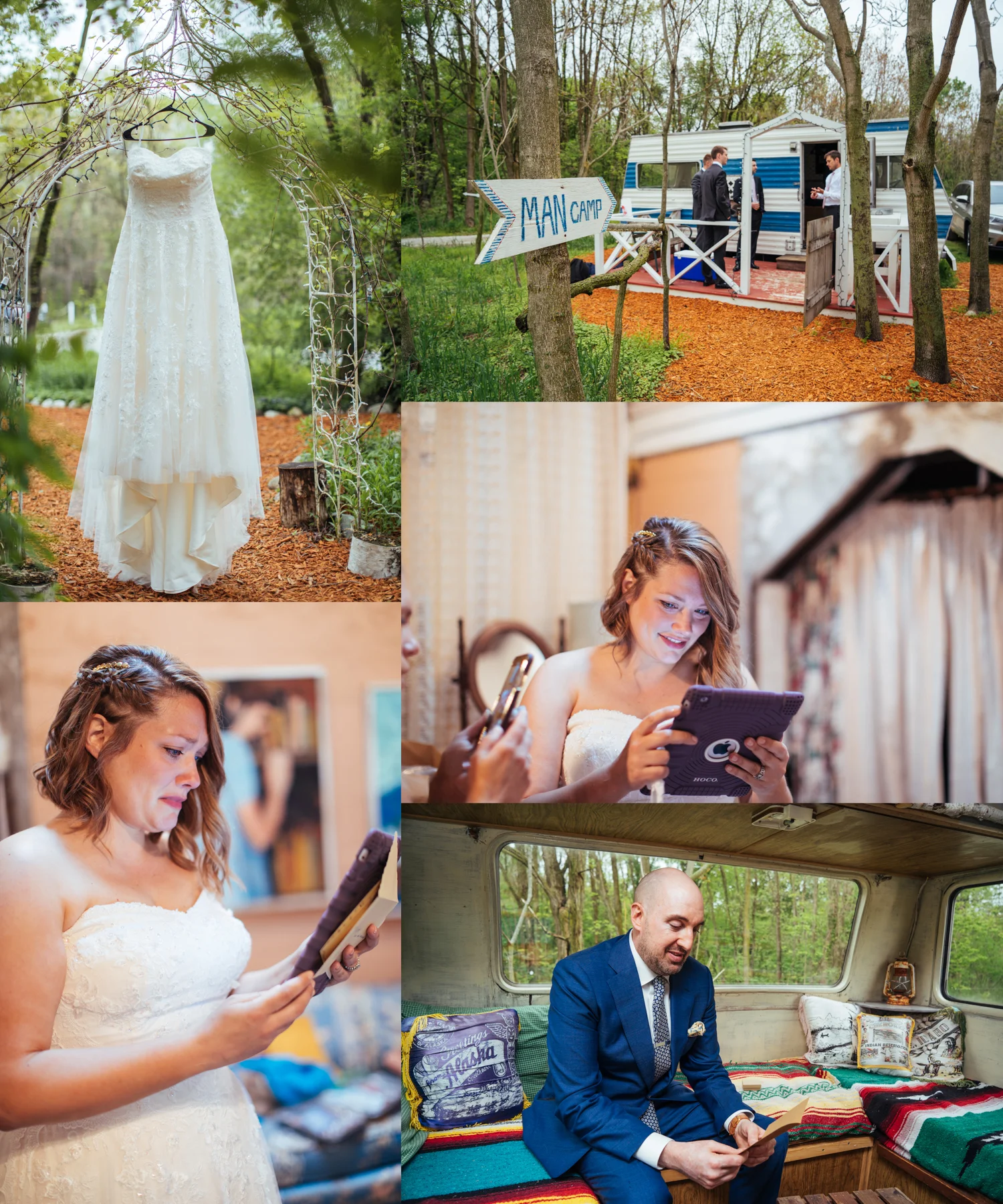 Going with the gorgeous outdoor wedding theme, these two got married at the Blue Dress Barn in Southwest Michigan. Both got ready on the premises (Amy in the Bridal Suite and Mike in the amazing Groom prep vintage RV) and were literally steps away from their guests when the ceremony started-!