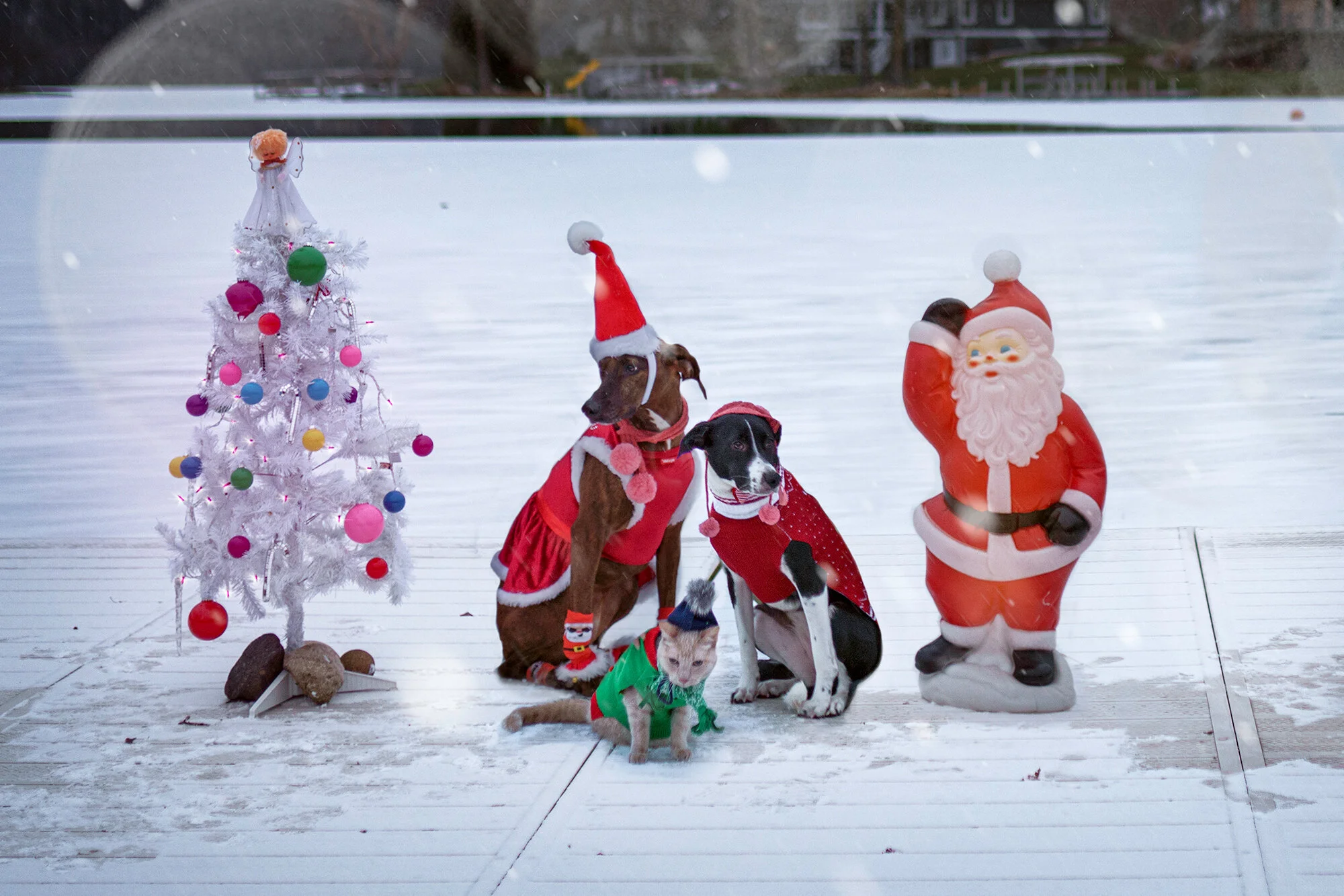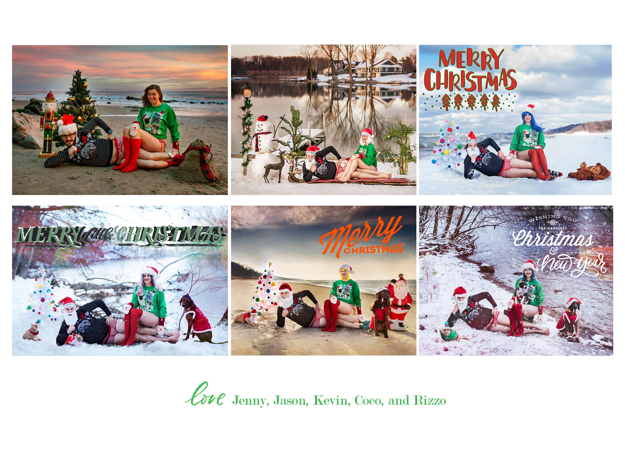 Though we had our pets by year #2/ Card 2, we only started including them in our 4th card and boy are Kevin and Coco happy that we didn’t start the tradition of including them sooner than that. We dress them all in their fancy discount Christmas winter dog clothes that we’ve gotten them over the years after the holidays and then set them in the snow. While we all stress over the very odd situation we try to at least get a few photos where we can see their faces and where they aren’t hunched over on the ground. Per those standards we’d say this year was a success!