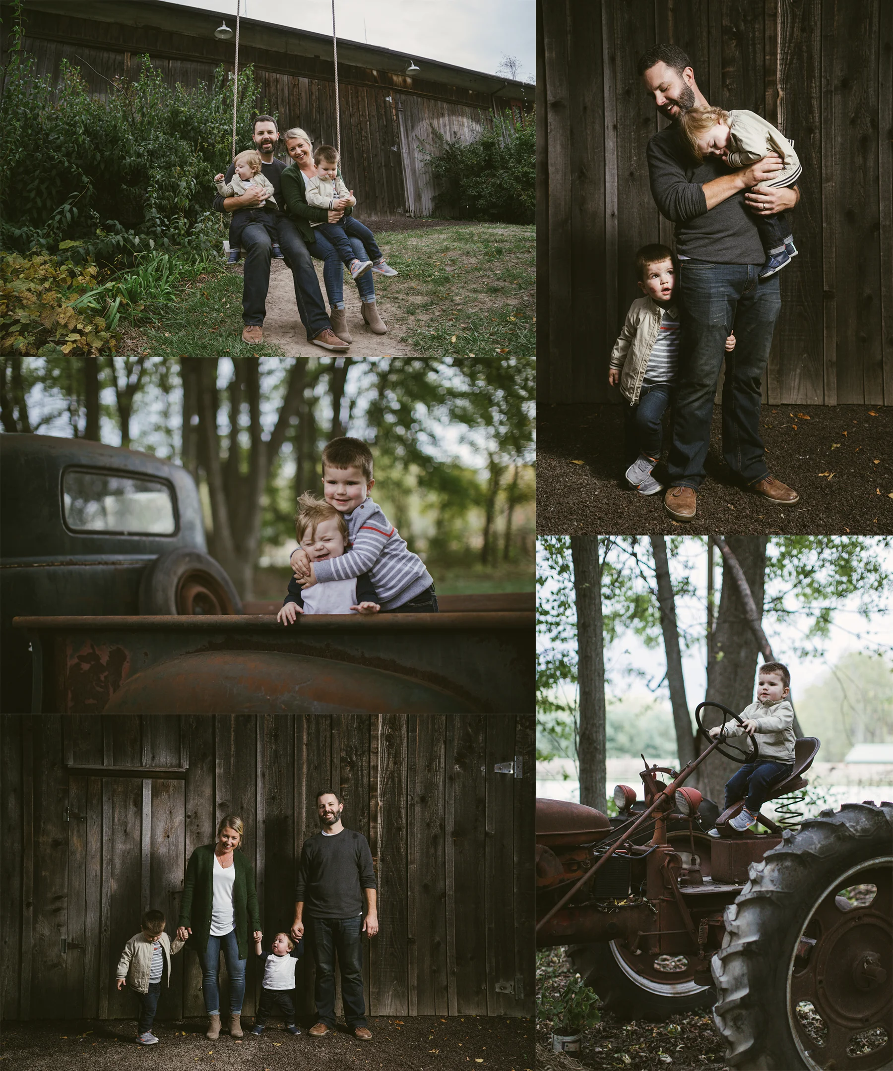 Though their family lives in South Bend (as do we), we headed up to Goshen for the Hooleys' fall Family Portrait Session! We love photographing at this location and we're so glad that Heather chose this spot from the list of possible locations for their family photos. The place has a very rural, country look to it with tons of old cars, a pond, and barn scattered throughout the property and this year finally started hosting weddings within the barn-! (The owners are fantastic and remodeled the home and barn on the property in order to host events and weddings on the property. The work they put in over last fall and winter paid off immensely and it was wonderful to see the new updates on the barn, bridal suite, etc.) We started off photographing the family on and near the old cars (which are such rustic beauties), then let the boys play around a bit in a truck bed!