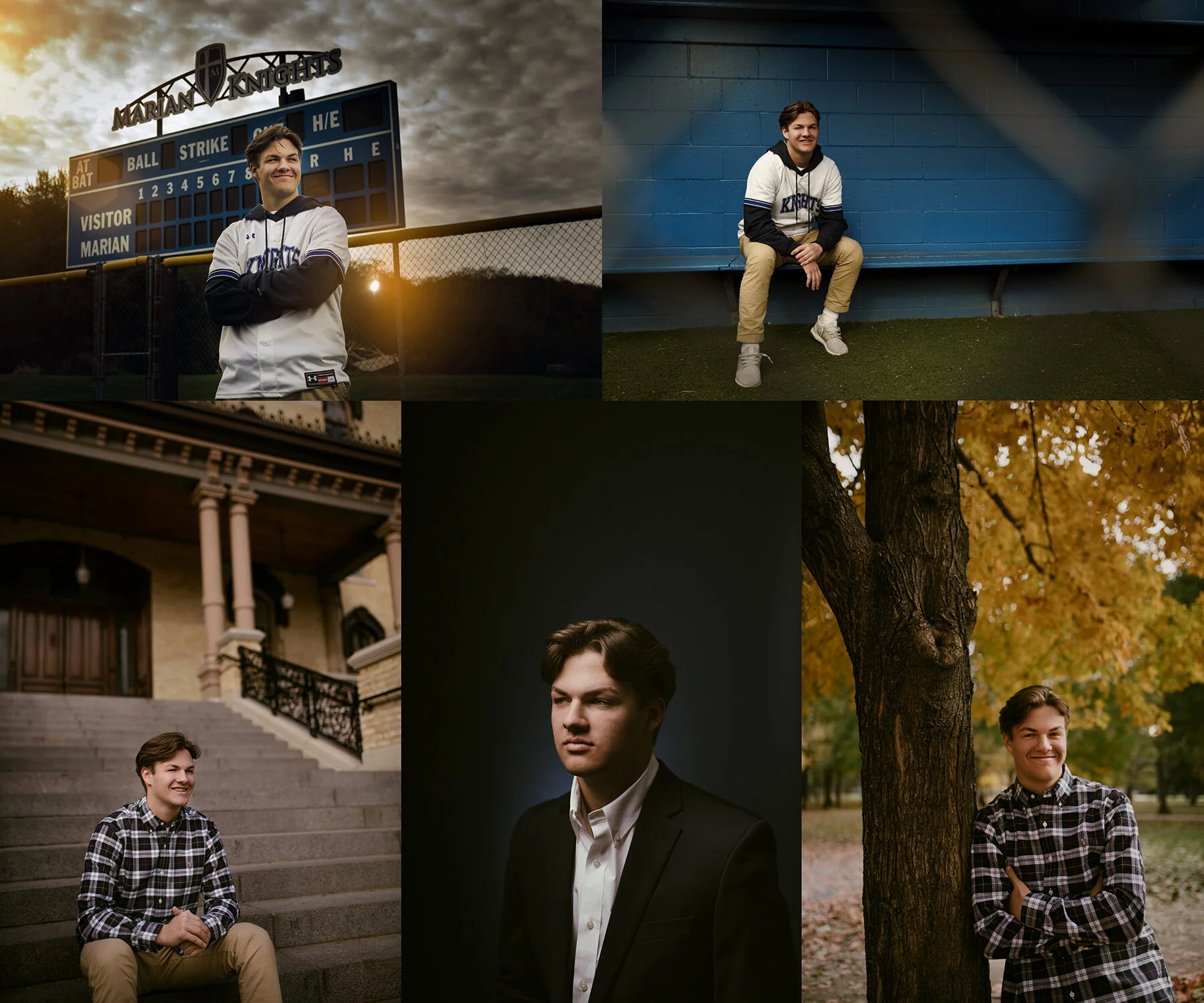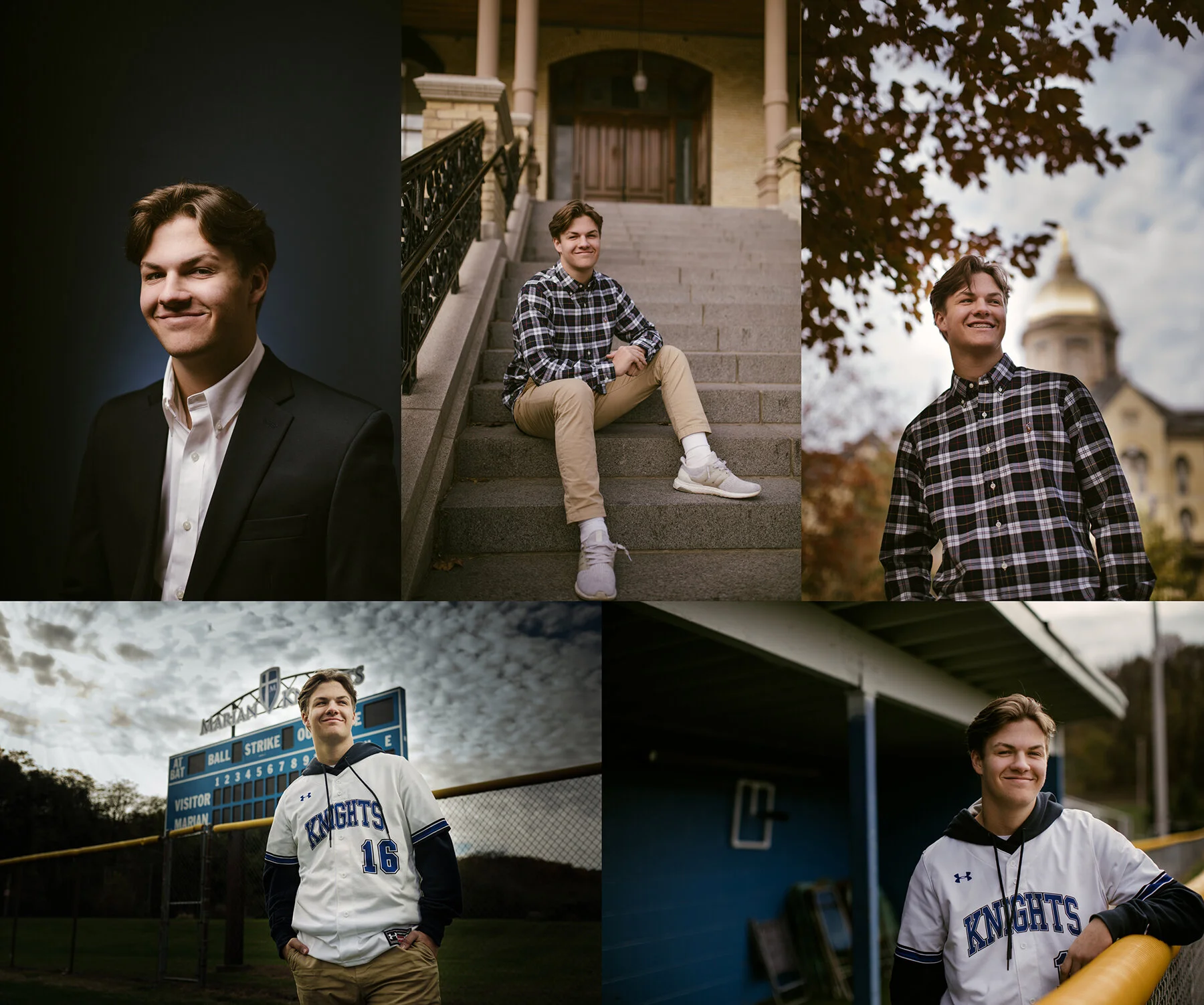 It’s Timmy’s Senior Year! This month of November amidst our last weddings, engagements, family portraits, etc. of 2019 we also captured some other awesome clients including Timmy for his Senior Portraits-! Timmy and his mom decided on his high school (Marian High School) for some baseball field Senior Photos, the University of Notre Dame for some fall-esque portraits, and our indoor studio for some final formal portraits for his Senior Portrait Session during this his last year of high school-!